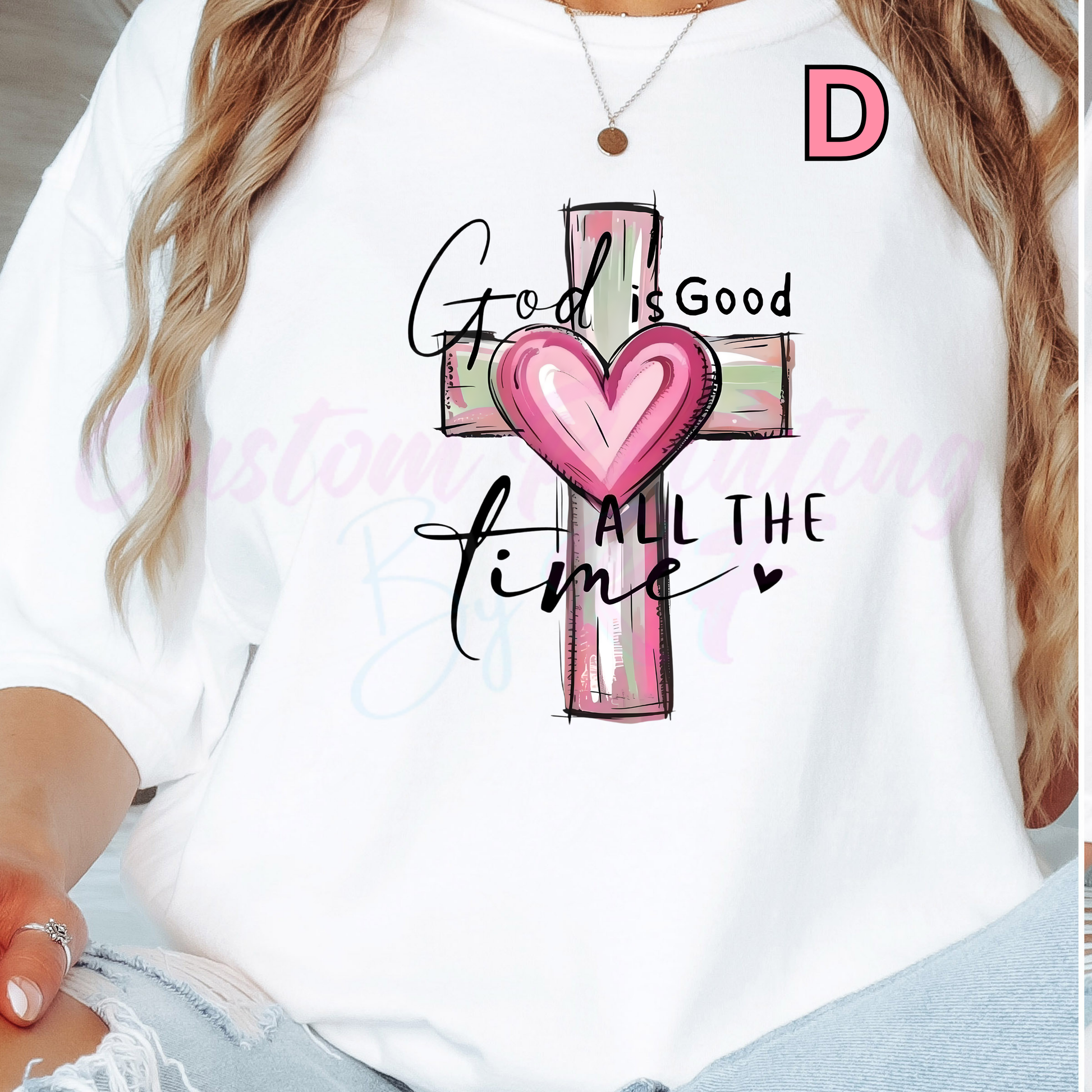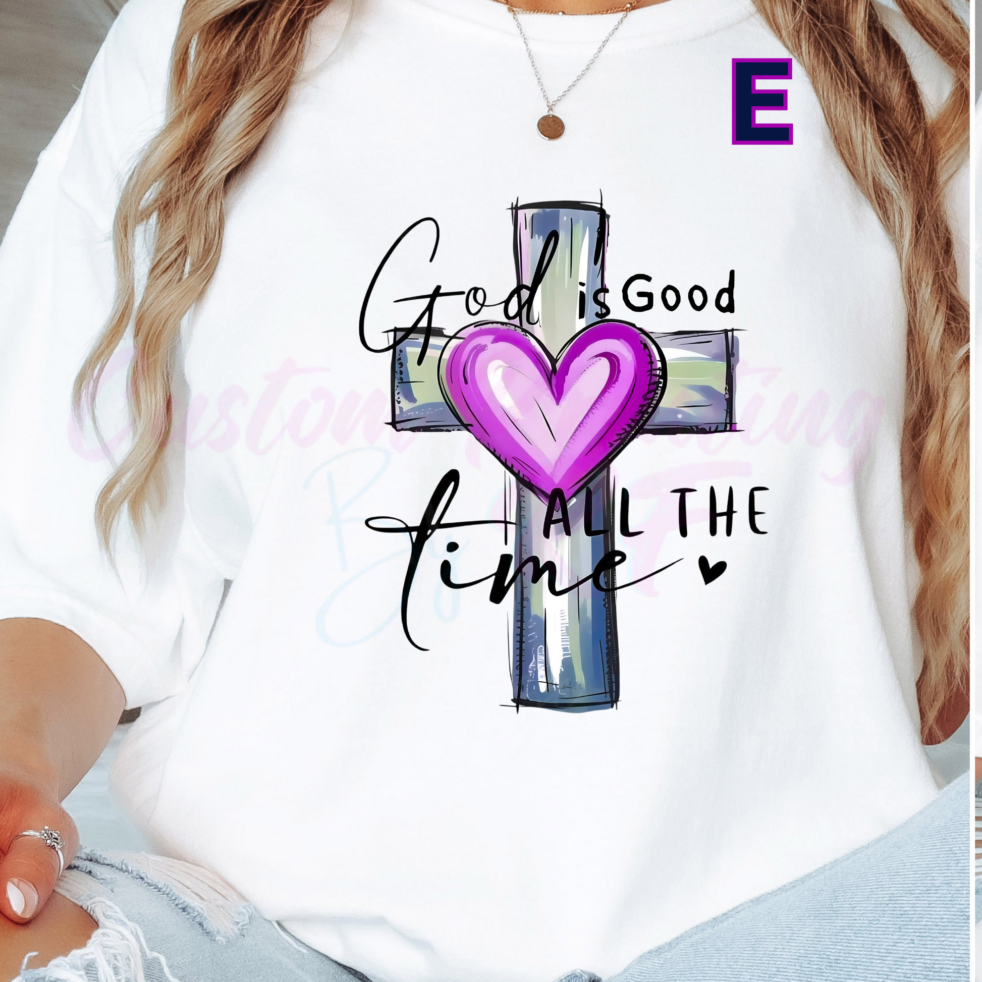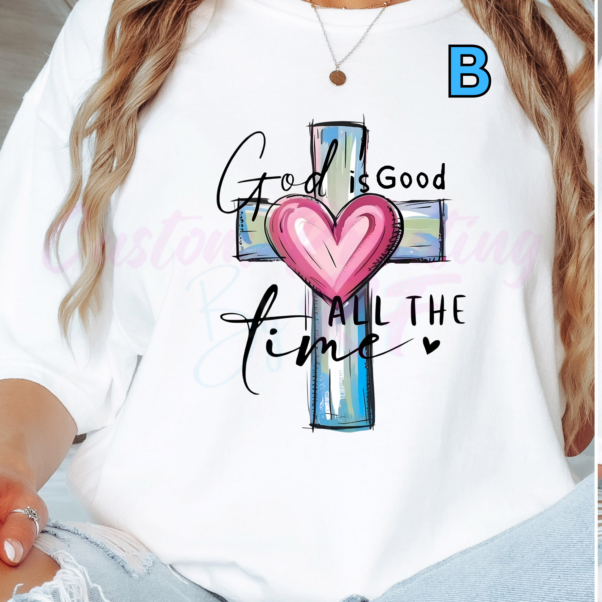 Our Christian T-shirts are made in the USA with premium-quality, soft cotton-blend materials that provide both comfort and durability, designed for both men and women God Is Good Cross All The Time Shirts Design